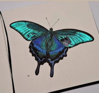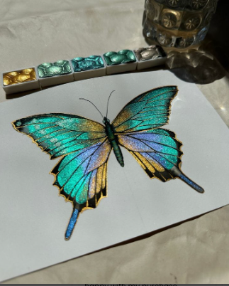 Nakreslila som motýľa tenkým štetcom a potom pridala zlaté odlesky. Výsledok je ohromujúci, aj na tmavom papieri ✨🦋